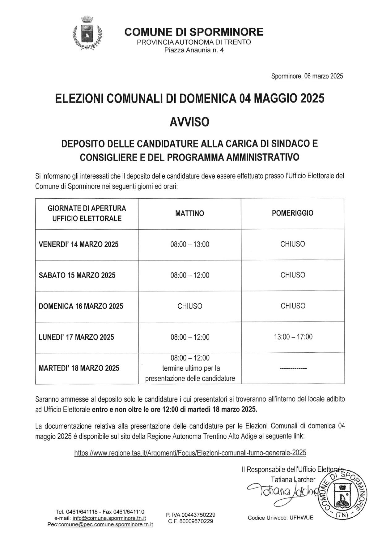 Si informano gli interessati che il deposito delle candidature deve essere effettuato presso l’Ufficio Elettorale del Comune di Sporminore nei seguenti giorni ed orari: